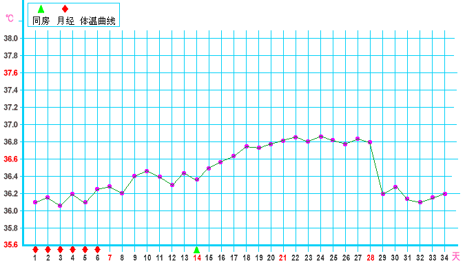 女性月经周期以月经见红第一天为周期的开始,周期的长短因人而异,约为21-35天不等,平均约为28天,其中又以排卵日为分隔,分为排卵前的滤泡期,与排卵后的黄体期。滤泡期长短不一定,但黄体期固定约为14天上下两天。排卵后次日,因卵巢形成黄体,分泌黄体素会使体温上升摄氏0。6度左右,而使体温呈现高低两相变化。高温期约持续12-16天(平均14天)。